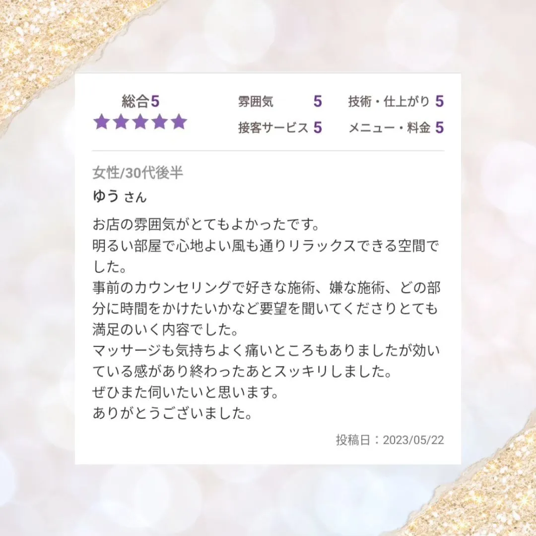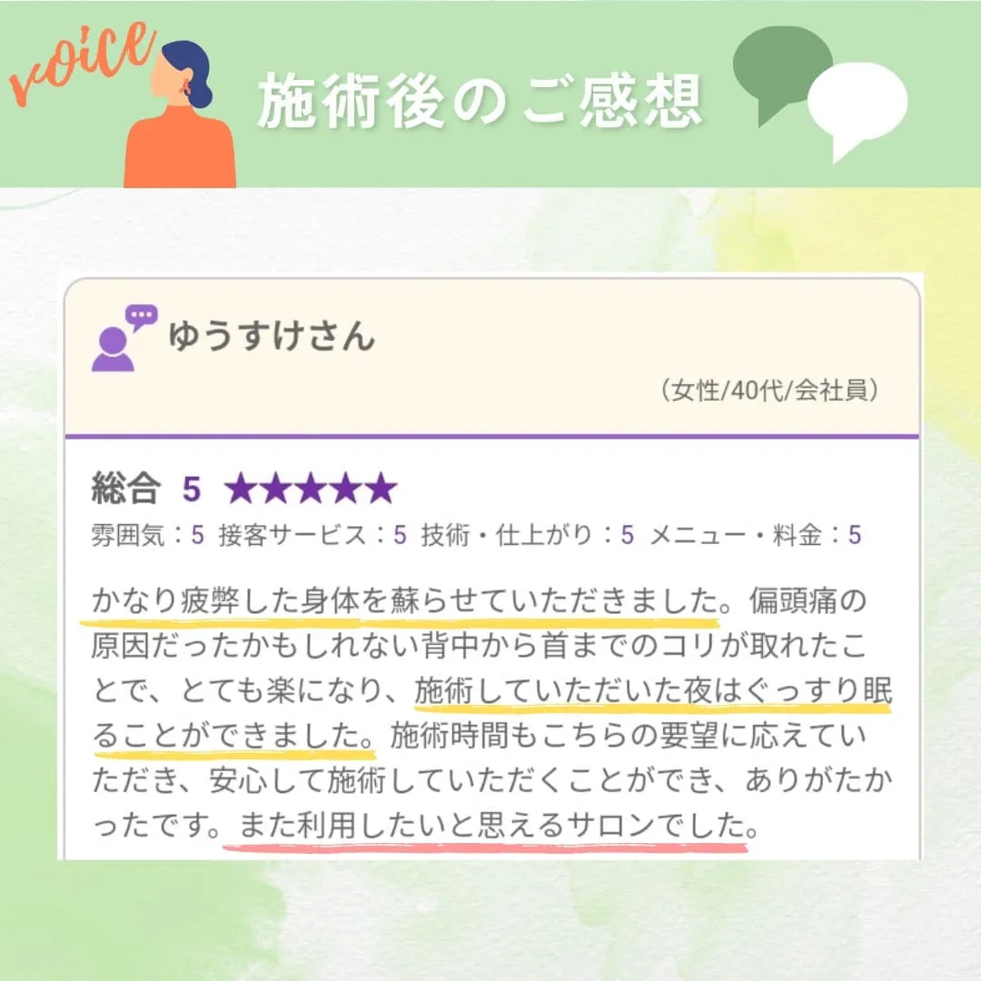 実際にサロンのサービスや施術を体験されたお客様のお声を紹介しております。また、各詳細ページにはお客様のお悩みに合わせた施術の内容を紹介しておりますので、ご利用の際の参考になれば幸いです。